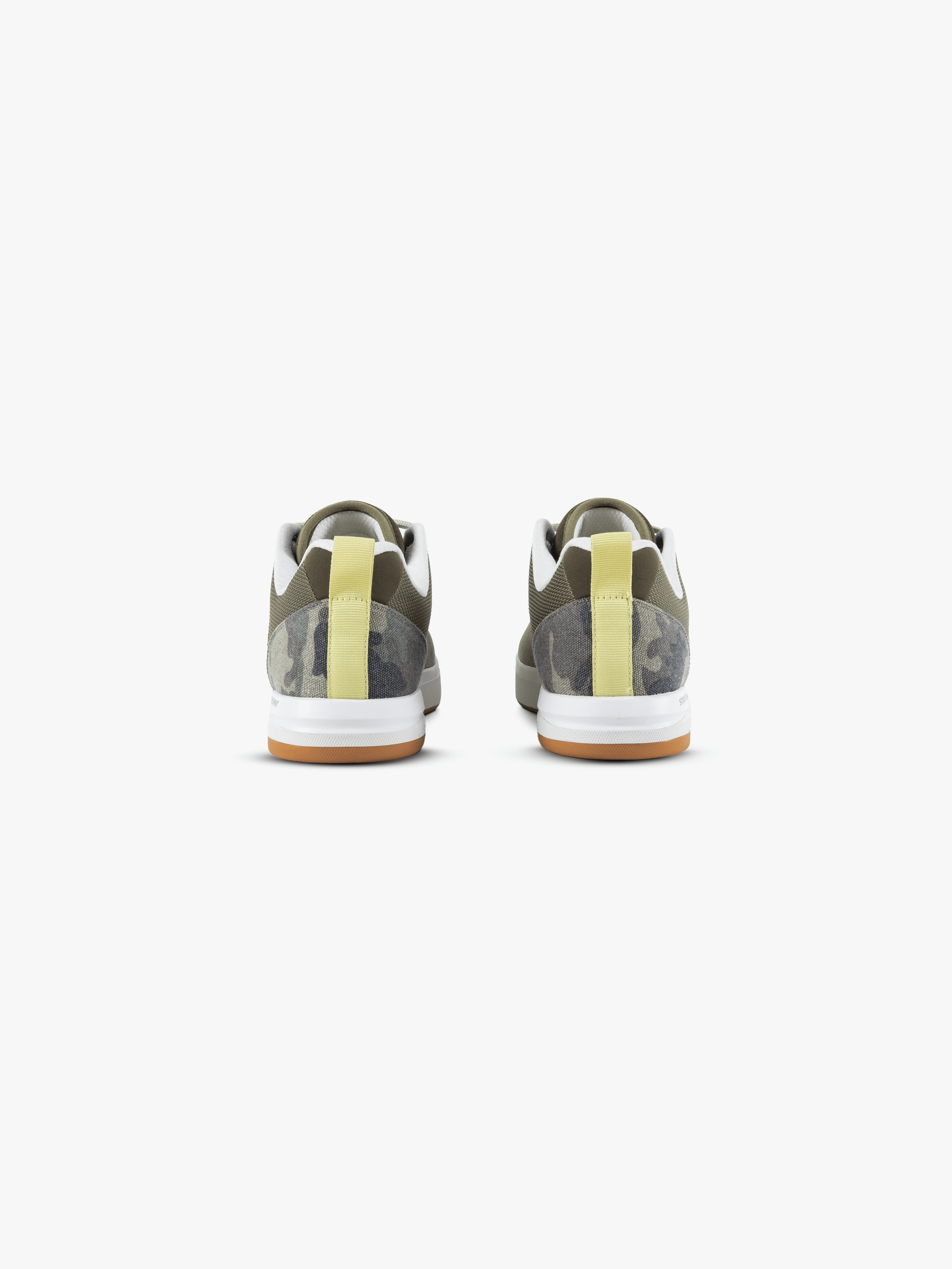 Custom camo printed upper with vintage two-tone white midsole and gum rubber outsole. Muted yellow contrast on heel pull and lace hits. with reflective silver flag logo on tongue.